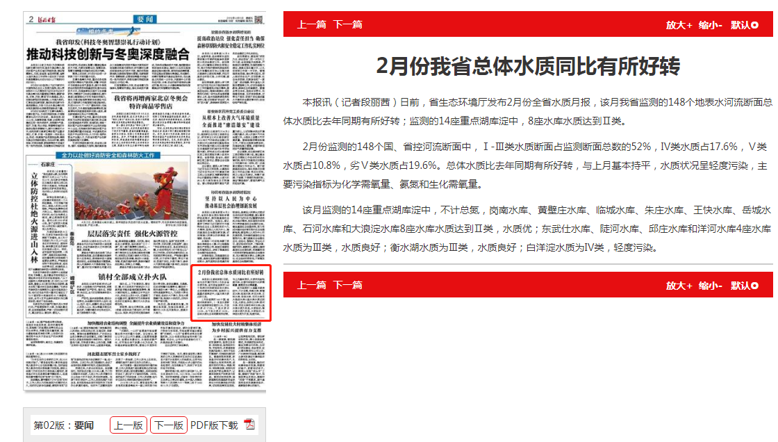 本报讯(记者段丽茜)日前,成人视频 发布2月份全省水质月报,该月我省监测的148个地表水河流断面总体水质比去年同期有所好转;监测的14座重点湖库淀中,8座水库水质达到Ⅱ类。