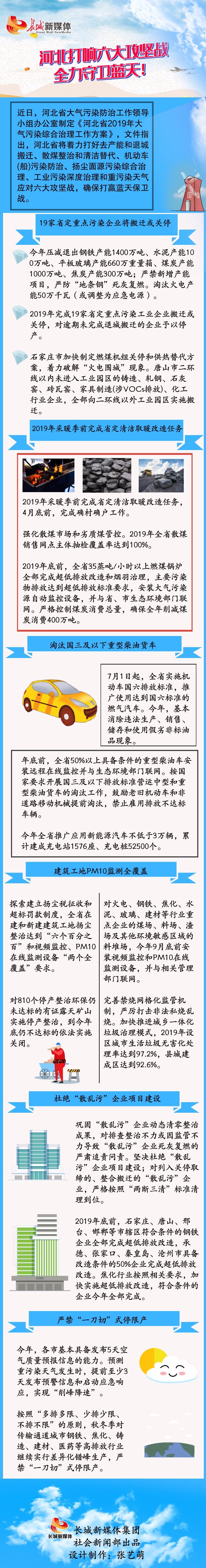 长城网4月10日讯(记者 张艺萌)近日,河北省大气污染防治工作领导小组办公室制定《河北省2019年大气污染综合治理工作方案》,文件指出,河北省将着力打好去产能和退城搬迁、散煤整治和清洁替代、机动车(船)污染防治、扬尘面源污染综合治理、工业污染深度治理和重污染天气应对六大攻坚战,确保打赢蓝天保卫战。一起来看看有哪些强有力的措施吧!