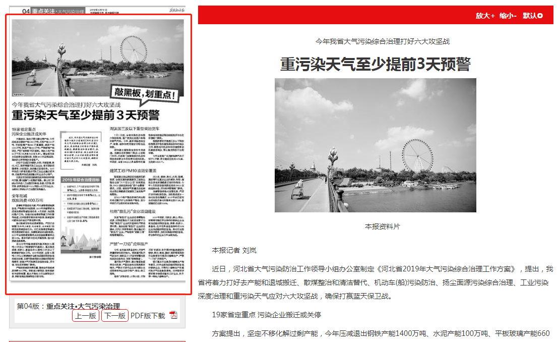 近日,河北省大气污染防治工作领导小组办公室制定《河北省2019年大气污染综合治理工作方案》,提出,我省将着力打好去产能和退城搬迁、散煤整治和清洁替代、机动车(船)污染防治、扬尘面源污染综合治理、工业污染深度治理和重污染天气应对六大攻坚战,确保打赢蓝天保卫战。