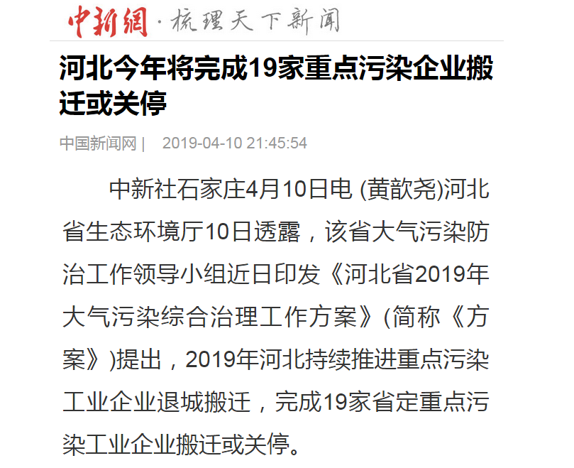 中新社石家庄4月10日电 (黄歆尧)成人视频 10日透露,该省大气污染防治工作领导小组近日印发《河北省2019年大气污染综合治理工作方案》(简称《方案》)提出,2019年河北持续推进重点污染工业企业退城搬迁,完成19家省定重点污染工业企业搬迁或关停。