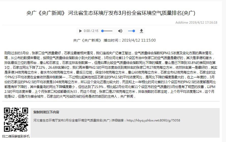 央广《央广新闻》:成人视频 发布3月份全省环境空气质量排名