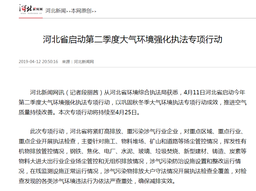 河北新闻网讯(记者段丽茜)从河北省环境综合执法局获悉,4月11日河北省启动今年第二季度大气环境强化执法专项行动,以巩固秋冬季大气环境执法专项行动成效,推进空气质量持续改善。本次专项行动将持续至4月25日。