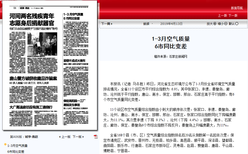 公布了1-3月份全省环境空气质量排名情况。全省11个设区市平均综合指数为 6.95,其中张家口、承德、秦皇岛、廊坊、沧州低于平均指数,唐山、衡水、保定、邯郸、邢台、石家庄高于平均指数。有6个市空气质量同比变差。