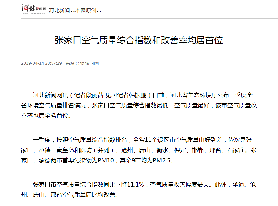 张家口市空气质量综合指数同比下降11.1%,空气质量改善幅度最大。此外,承德、沧州、唐山、邢台空气质量同比均改善。