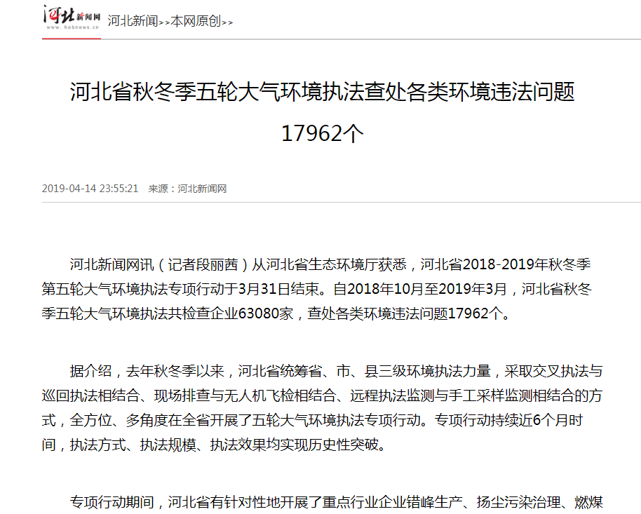 严格执法,倒逼了企业提升治理水平,从源头减少了污染排放。持续加大执法监管力度,巩固秋冬季大气环境执法专项行动成效,4月11日,河北省启动今年第二季度大气环境强化执法专项行动,推进空气质量持续改善。