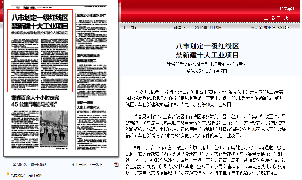 印发《关于改善大气环境质量实施区域差别化环境准入的指导意见》明确,石家庄、保定等8市为大气传输通道一级红线区,禁止新建和扩建钢铁、火电、水泥等10大工业项目。