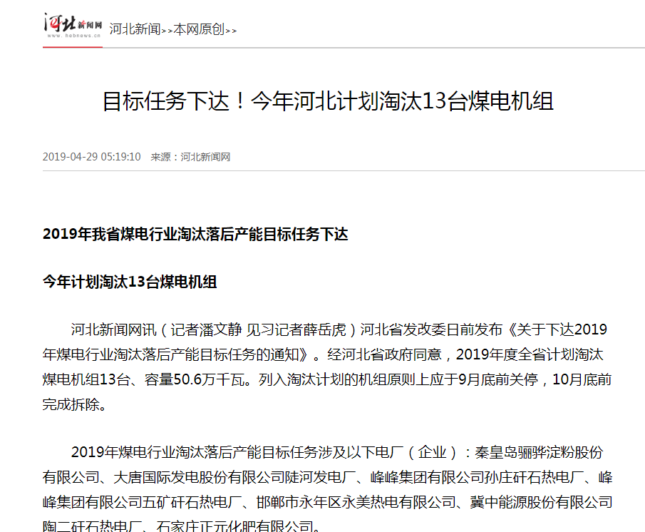 河北新闻网讯(记者潘文静 见习记者薛岳虎)河北省发改委日前发布《关于下达2019年煤电行业淘汰落后产能目标任务的通知》。经河北省政府同意,2019年度全省计划淘汰煤电机组13台、容量50.6万千瓦。列入淘汰计划的机组原则上应于9月底前关停,10月底前完成拆除。