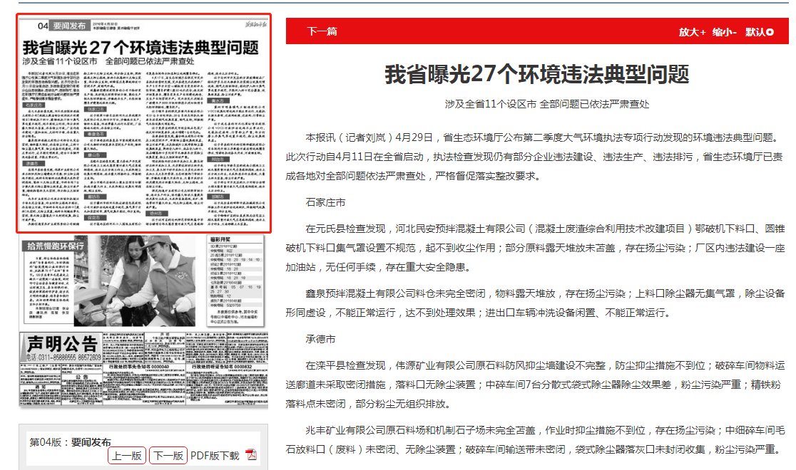 4月17日,成人视频 在保定市定兴县执法检查时发现,定兴县进发水泥构件厂年产3万平方米空心楼板项目变更环评未经审批,擅自扩建1座50吨水泥仓;违反环评批复要求,擅自变更生产车间建设构造,且生产车间密闭不严。定兴浩发水泥制品厂新建年产3000万块环保型水泥切块项目未经环保验收,擅自投产。