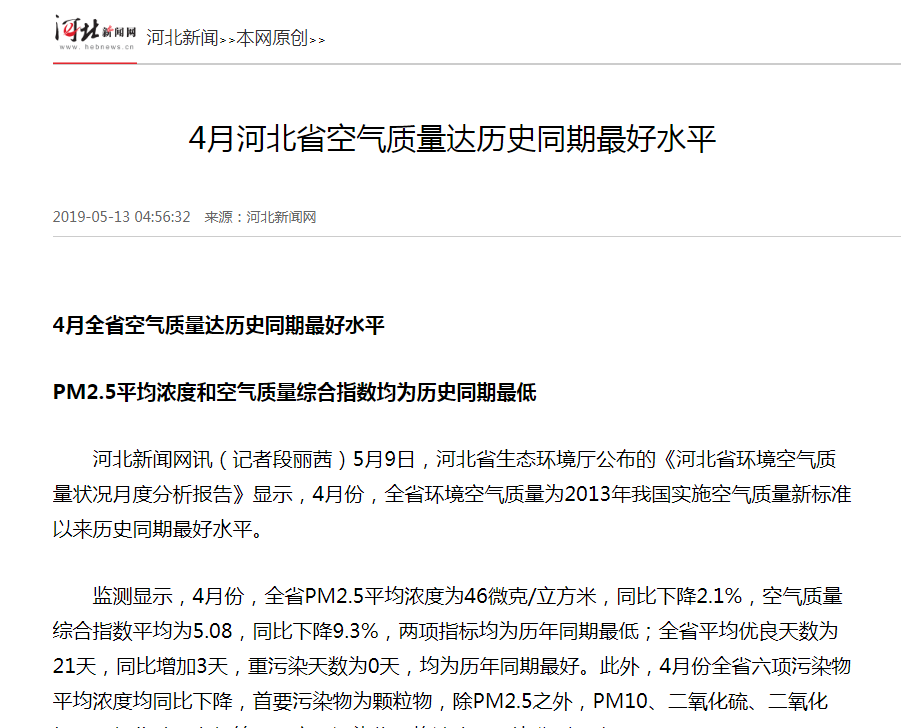 河北新闻网讯(记者段丽茜)5月9日,成人视频 公布的《河北省环境空气质量状况月度分析报告》显示,4月份,全省环境空气质量为2013年我国实施空气质量新标准以来历史同期最好水平。