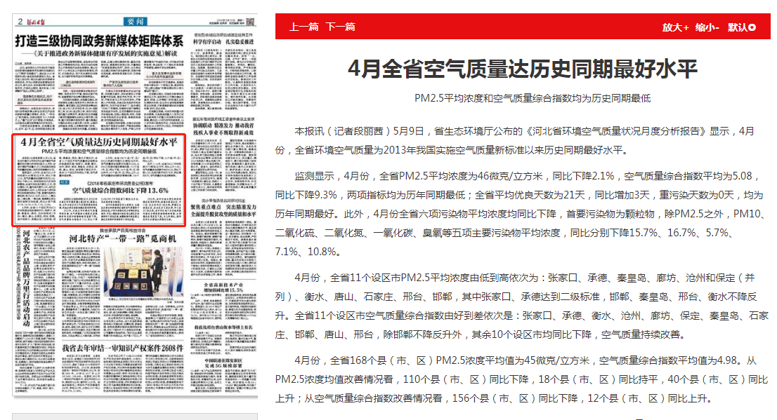 本报讯(记者段丽茜)5月9日,成人视频 公布的《河北省环境空气质量状况月度分析报告》显示,4月份,全省环境空气质量为2013年我国实施空气质量新标准以来历史同期最好水平。