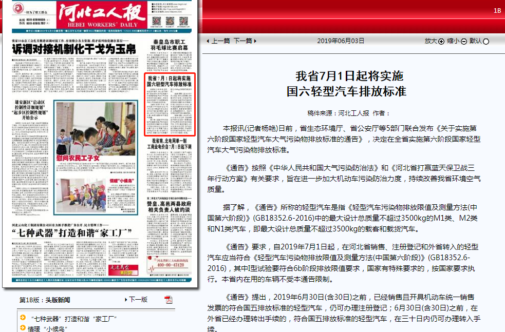 、省公安厅等5部门联合发布《关于实施第六阶段国家轻型汽车大气污染物排放标准的通告》,决定在全省实施第六阶段国家轻型汽车大气污染物排放标准。 《通告》按照《中华人民共和国大气污染防治法》和《河北省打赢蓝天保卫战三年行动方案》有关要求,旨在进一步加大机动车污染防治力度,持续改善我省环境空气质量。 据了解,《通告》所称的轻型汽车是指《轻型汽车污染物排放限值及测量方法(中国第六阶段)》(GB18352.6-2016)中的最大设计总质量不超过3500kg的M1类、M2类和N1类汽车,即最大设计总质量不超过3500kg的载客和载货汽车。 《通告》要求,自2019年7月1日起,在河北省销售、注册登记和外省转入的轻型汽车应当符合《轻型汽车污染物排放限值及测量方法(中国第六阶段)》(GB18352.6-2016),其中I型试验要符合6b阶段排放限值要求,国家有特殊要求的,按国家要求执行。本省内在用的车辆不受本通告限制。 《通告》提出,2019年6月30日(含30日)之前,已经销售且开具机动车统一销售发票的符合国五排放标准的轻型汽车,仍可办理注册登记;6月30日(含30日)之前,在外省已经办理转出手续的,符合国五排放标准的轻型汽车,在三十日内仍可办理转入手续。