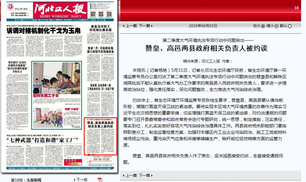 环境监察专员张桂生要求,赞皇县、高邑县要认清当前形势,增强打赢蓝天保卫战的紧迫感。要将实现本区域大气环境质量的改善作为落实习近平生态文明思想的重要举措,切实增强打赢蓝天保卫战的紧迫感,对约谈通报的问题要专门召开县委常委会和政府常务会进行专题研究,统一思想,制定措施,压实责任,落实到位,扎扎实实做好各项大气污染综合治理具体工作。两县政府相关职能部门要按照职责分工,制定监督检查方案,加强对本辖区内工业企业污染防治、施工工地或物料堆场扬尘污染、重污染天气应急和采暖季错峰生产、秸秆或垃圾焚烧等方面的监管力度。 赞皇、高邑两县政府相关负责人作了表态,坚决诚恳接受约谈,全盘接受通报问题。