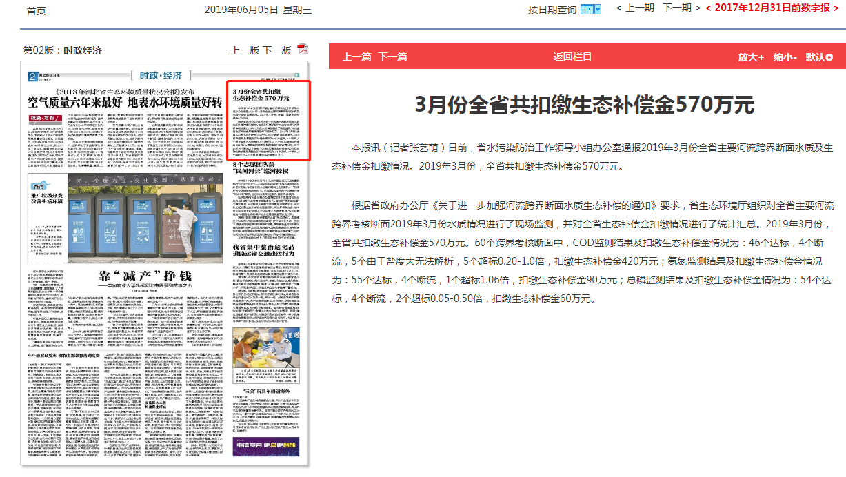 本报讯(记者张艺萌)日前,省水污染防治工作领导小组办公室通报2019年3月份全省主要河流跨界断面水质及生态补偿金扣缴情况。2019年3月份,全省共扣缴生态补偿金570万元。