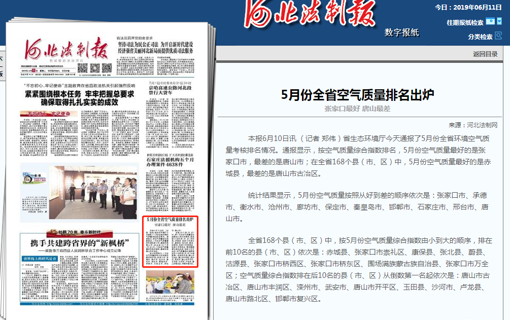 全省168个县(市、区)中,按5月份空气质量综合指数由小到大的顺序,排在前10名的县(市、区)依次是:赤城县、张家口市崇礼区、康保县、张北县、蔚县、沽源县、张家口市桥西区、张家口市桥东区、围场满族蒙古族自治县、张家口市万全区;空气质量综合指数排在后10名的县(市、区)从倒数第一名起依次是:唐山市古冶区、唐山市丰润区、滦州市、武安市、唐山市开平区、玉田县、沙河市、卢龙县、唐山市路北区、邯郸市复兴区。