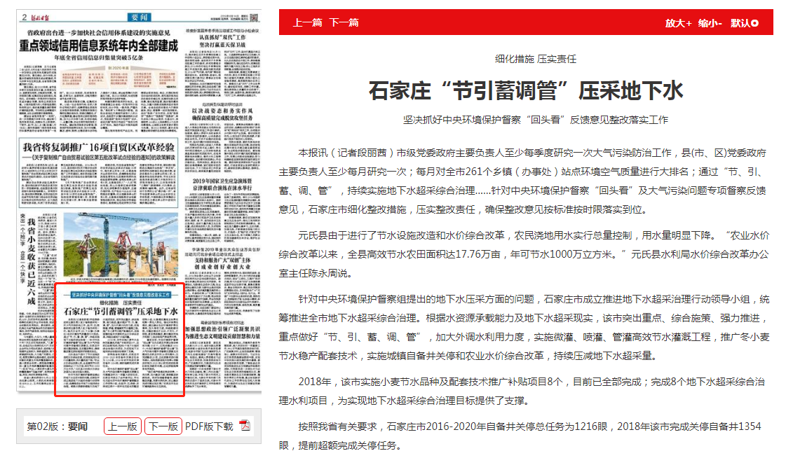 针对中央环境保护督察组提出的地下水压采方面的问题,石家庄市成立推进地下水超采治理行动领导小组,统筹推进全市地下水超采综合治理。根据水资源承载能力及地下水超采现实,该市突出重点、综合施策、强力推进,重点做好“节、引、蓄、调、管”,加大外调水利用力度,实施微灌、喷灌、管灌高效节水灌溉工程,推广冬小麦节水稳产配套技术,实施城镇自备井关停和农业水价综合改革,持续压减地下水超采量。