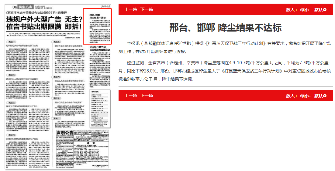经过监测,全省各市(含定州、辛集市)降尘量范围在4.9-10.7吨/平方公里·月之间,平均为7.7吨/平方公里·月,同比下降28.0%。邢台、邯郸市建成区降尘量大于《打赢蓝天保卫战三年行动计划》中对重点区域城市的考核标准9吨/平方公里·月,降尘结果不达标。