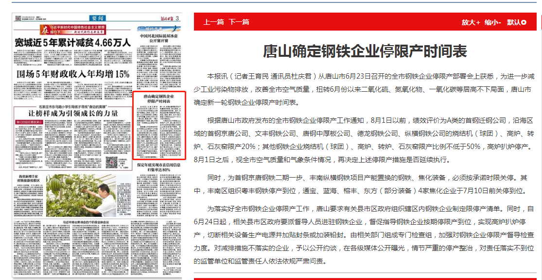为落实好全市钢铁企业停限产工作,唐山要求有关县市区政府组织辖区内钢铁企业制定限停产清单。同时,自6月24日起,相关县市区政府要派督导人员进驻钢铁企业,督促指导钢铁企业按期停限产到位,实现高炉扒炉停产,切断相关设备生产电源并加贴封条或加装铅封。由相关部门组成专门检查组,加强对钢铁企业停限产督导检查力度。对减排措施不落实的企业,予以公开约谈,在各级媒体公开曝光,情节严重的停产整治,对责任落实不到位的监管单位和监管责任人依法依规严肃问责。
