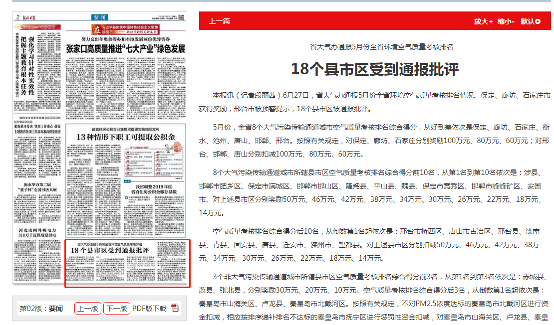 通报提出,对5月份大气污染传输通道城市空气质量综合指数改善幅度和PM2.5平均浓度改善幅度排名倒数第1名的邢台市予以预警提示。