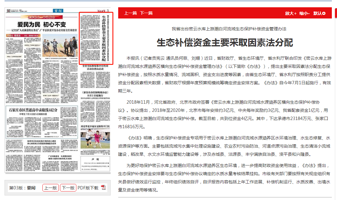 2018年11月,河北省政府、北京市政府签署《密云水库上游潮白河流域水源涵养区横向生态保护补偿协议》。协议提出,2018年至2020年,北京市每年安排约3亿元、中央每年奖励约3亿元、我省配套资金1亿元,用于密云水库上游潮白河流域生态保护补偿。截至目前,共到位资金4亿元。其中,下达承德市23184万元、张家口市16816万元。