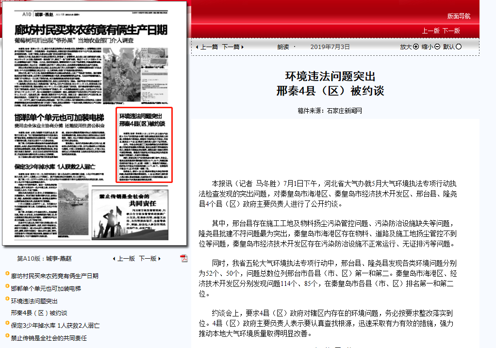 本报讯(记者 马冬胜)7月1日下午,河北省大气办就5月大气环境执法专项行动执法检查发现的突出问题,对秦皇岛市海港区、秦皇岛市经济技术开发区、邢台县、隆尧县4个县(区)政府主要负责人进行了公开约谈。 其中,邢台县存在施工工地及物料扬尘污染管控问题、污染防治设施缺失等问题,隆尧县批建不符问题最为突出,秦皇岛市海港区存在物料、道路及施工地扬尘管控不到位等问题,秦皇岛市经济技术开发区存在污染防治设施不正常运行、无证排污等问题。 同时,我省五轮大气环境执法专项行动中,邢台县、隆尧县发现各类环境问题分别为52个、50个,问题总数位列邢台市各县(市、区)第一和第二。秦皇岛市海港区、经济技术开发区分别发现问题114个、85个,在秦皇岛市各县(市、区)排名第一和第二位。 约谈会上,要求4县(区)政府对辖区内存在的环境问题,务必按要求整改落实到位。4县(区)政府主要负责人表示要认真查找根源,迅速采取有力有效的措施,强力推动本地大气环境质量取得明显改善。