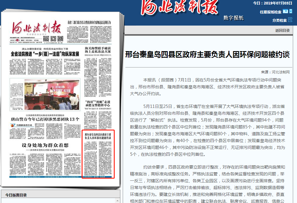 本报讯 (段丽茜)7月1日,因在5月份全省大气环境执法专项行动中问题突出,邢台市邢台县、隆尧县和秦皇岛市海港区、经济技术开发区政府主要负责人被省大气办公开约谈。