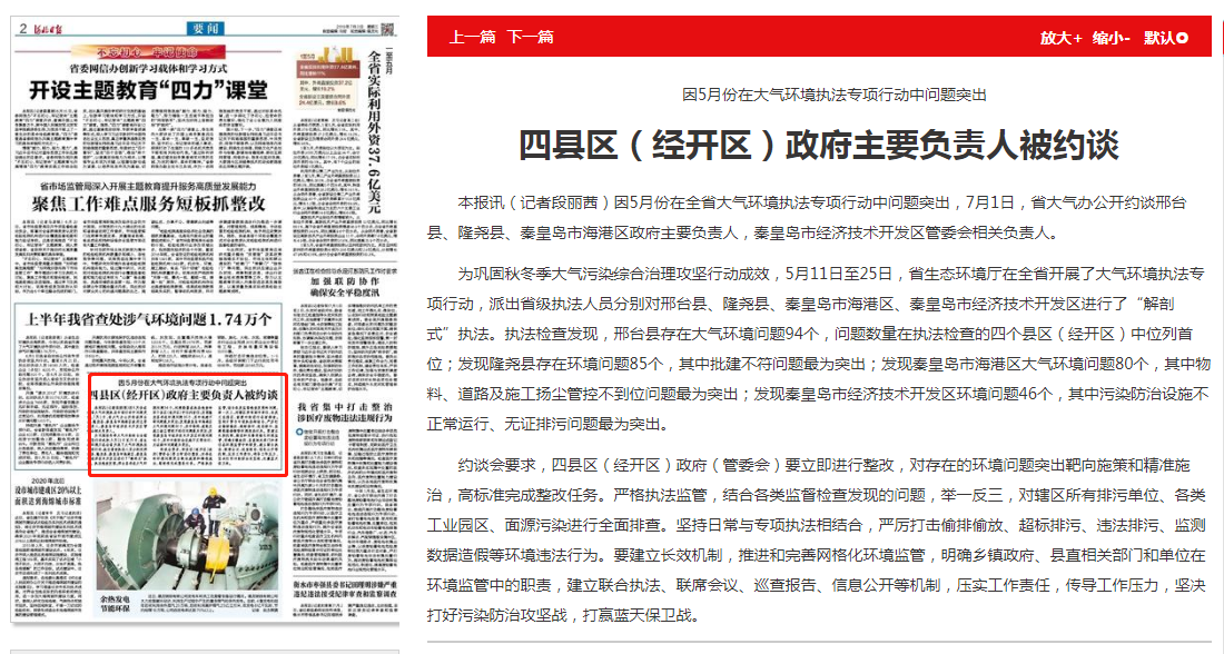 本报讯(记者段丽茜)因5月份在全省大气环境执法专项行动中问题突出,7月1日,省大气办公开约谈邢台县、隆尧县、秦皇岛市海港区政府主要负责人,秦皇岛市经济技术开发区管委会相关负责人。