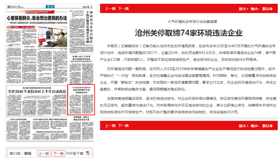 本报讯(记者戴绍志)记者日前从沧州市生态环境局获悉,在该市去年10月至今年5月开展的大气环境执法专项行动中,完成环境问题整改1857个,立案203件,拟处罚金额941.6万元,关停取缔环境违法企业74家,停产限产企业133家,行政拘留5人。对整改不到位继续违规生产、违法排污的企业,及时启动按日计罚程序。