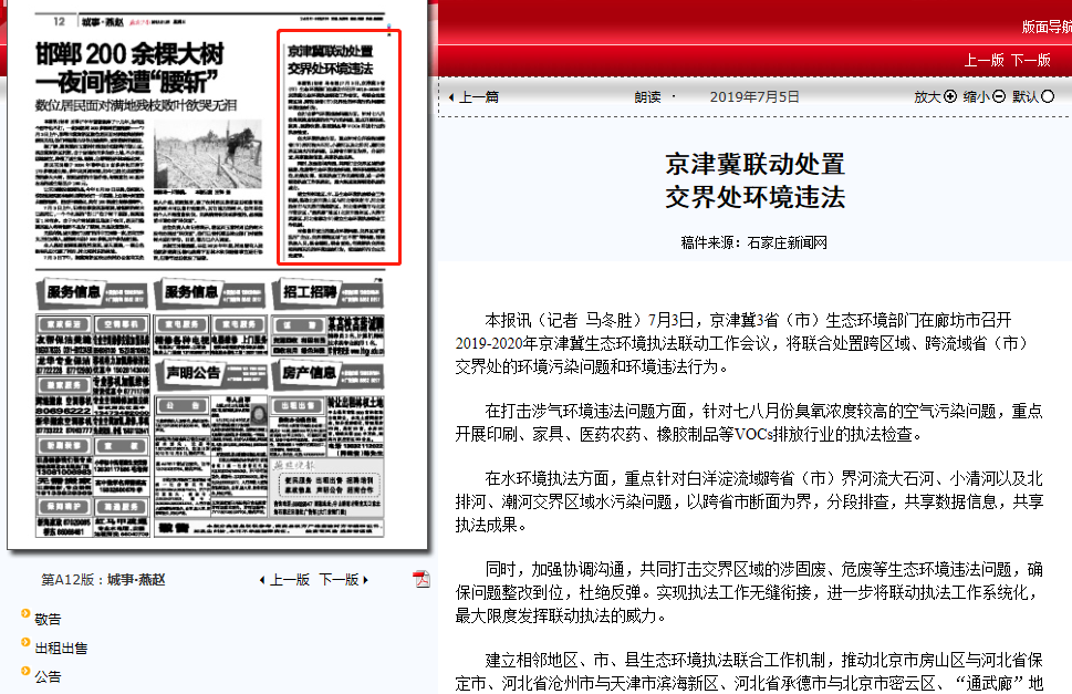 本报讯(记者 马冬胜)7月3日,京津冀3省(市)生态环境部门在廊坊市召开2019-2020年京津冀生态环境执法联动工作会议,将联合处置跨区域、跨流域省(市)交界处的环境污染问题和环境违法行为。 在打击涉气环境违法问题方面,针对七八月份臭氧浓度较高的空气污染问题,重点开展印刷、家具、医药农药、橡胶制品等VOCs排放行业的执法检查。 在水环境执法方面,重点针对白洋淀流域跨省(市)界河流大石河、小清河以及北排河、潮河交界区域水污染问题,以跨省市断面为界,分段排查,共享数据信息,共享执法成果。 同时,加强协调沟通,共同打击交界区域的涉固废、危废等生态环境违法问题,确保问题整改到位,杜绝反弹。实现执法工作无缝衔接,进一步将联动执法工作系统化,最大限度发挥联动执法的威力。 建立相邻地区、市、县生态环境执法联合工作机制,推动北京市房山区与河北省保定市、河北省沧州市与天津市滨海新区、河北省承德市与北京市密云区、“通武廊”地区(北京市通州区、天津市武清区、河北省廊坊市)建立生态环境执法联合工作机制。 对各自排查出的重点环境问题、交界区域“散乱污”企业、交界模糊区域“三不管”等问题,抽调执法人员,混合编组,联合查处,有效解决交界处和共同关注的环境违法行为,使违法排污企业无处遁形。