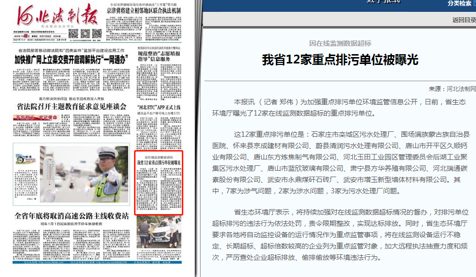 这12家重点排污单位是:石家庄市栾城区污水处理厂、围场满族蒙古族自治县医院、怀来县京成建材有限公司、蔚县清润污水处理有限公司、唐山市开平区久顺钙业有限公司、唐山东方炼焦制气有限公司、河北玉田工业园区管理委员会后湖工业聚集区污水处理厂、唐山市蓝欣玻璃有限公司、肃宁县方华养殖有限公司、河北瑞通碳素股份有限公司、武安市永鼎煤矸石砖厂、武安市增玉新型墙体材料有限公司。其中,7家为涉气问题,2家为涉水问题,3家为污水处理厂问题。