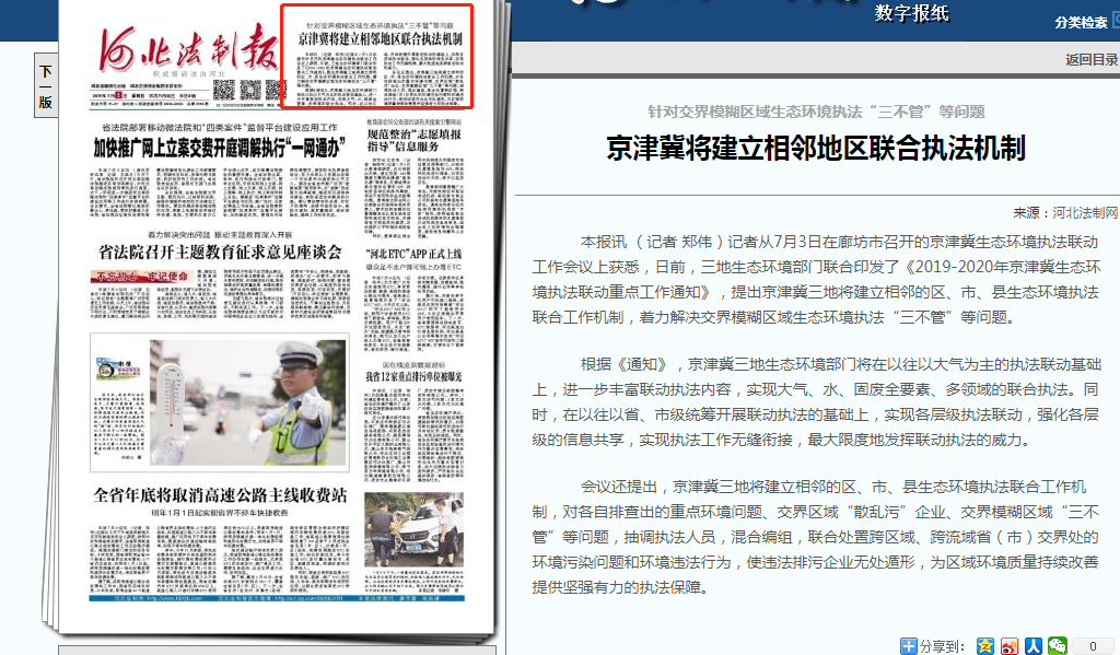 本报讯 (记者 郑伟)记者从7月3日在廊坊市召开的京津冀生态环境执法联动工作会议上获悉,日前,三地生态环境部门联合印发了《2019-2020年京津冀生态环境执法联动重点工作通知》,提出京津冀三地将建立相邻的区、市、县生态环境执法联合工作机制,着力解决交界模糊区域生态环境执法“三不管”等问题。