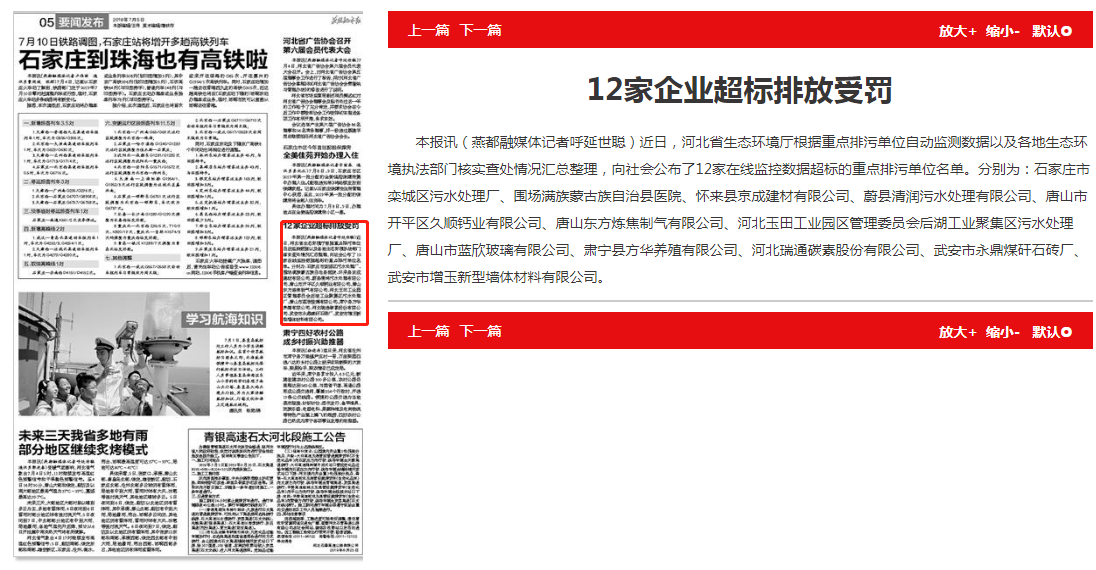 本报讯(燕都融媒体记者呼延世聪)近日,成人视频 根据重点排污单位自动监测数据以及各地生态环境执法部门核实查处情况汇总整理,向社会公布了12家在线监控数据超标的重点排污单位名单。分别为:石家庄市栾城区污水处理厂、围场满族蒙古族自治县医院、怀来县京成建材有限公司、蔚县清润污水处理有限公司、唐山市开平区久顺钙业有限公司、唐山东方炼焦制气有限公司、河北玉田工业园区管理委员会后湖工业聚集区污水处理厂、唐山市蓝欣玻璃有限公司、肃宁县方华养殖有限公司、河北瑞通碳素股份有限公司、武安市永鼎煤矸石砖厂、武安市增玉新型墙体材料有限公司。