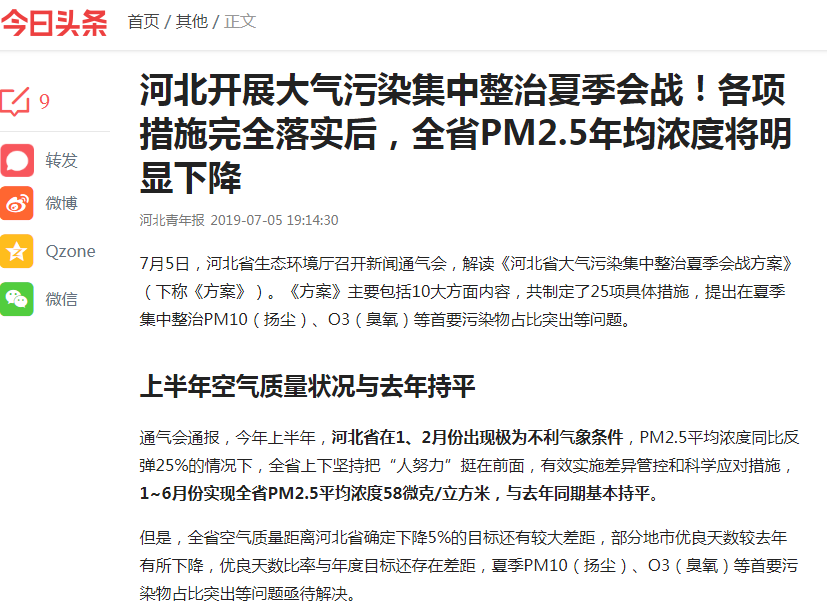 河北青年报:河北开展大气污染集中整治夏季会战!各项措施完全落实后,全省PM2.5年均浓度将明显下降