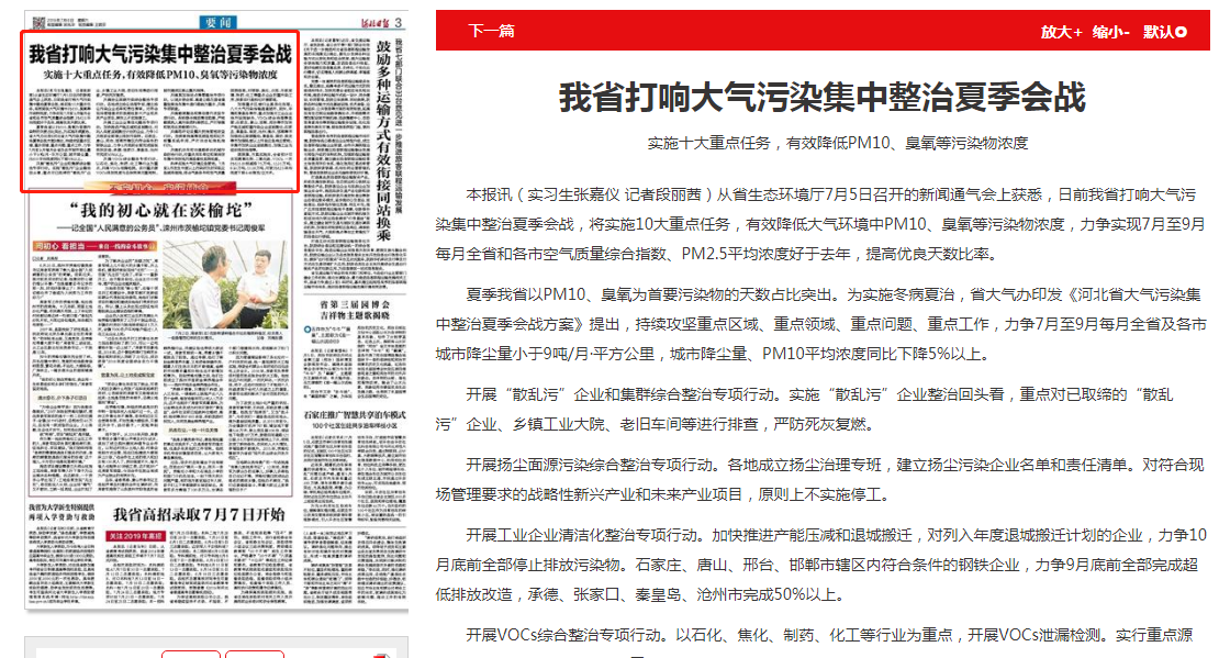 夏季我省以PM10、臭氧为首要污染物的天数占比突出。为实施冬病夏治,省大气办印发《河北省大气污染集中整治夏季会战方案》提出,持续攻坚重点区域、重点领域、重点问题、重点工作,力争7月至9月每月全省及各市城市降尘量小于9吨/月·平方公里,城市降尘量、PM10平均浓度同比下降5%以上。