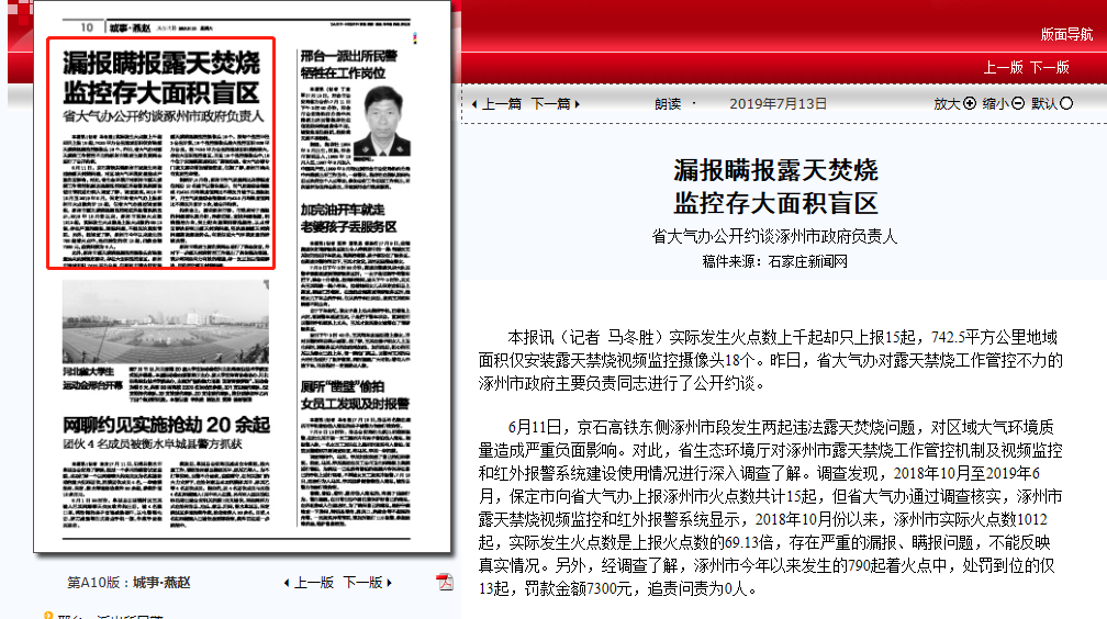 对涿州市露天禁烧工作管控机制及视频监控和红外报警系统建设使用情况进行深入调查了解。调查发现,2018年10月至2019年6月,保定市向省大气办上报涿州市火点数共计15起,但省大气办通过调查核实,涿州市露天禁烧视频监控和红外报警系统显示,2018年10月份以来,涿州市实际火点数1012起,实际发生火点数是上报火点数的69.13倍,存在严重的漏报、瞒报问题,不能反映真实情况。另外,经调查了解,涿州市今年以来发生的790起着火点中,处罚到位的仅13起,罚款金额7300元,追责问责为0人。 此外,涿州市露天禁烧视频监控摄像头安装数量远未达到规定要求,存在大面积监控盲区。涿州市地域面积742.5平方公里,但涿州市境内仅安装露天禁烧视频监控摄像头18个。按每个监控半径3公里计算,18个监控摄像头最大监控面积508平方公里,距742.5平方公里的地域面积差距较大,存在大面积监控盲区。而且18个监控摄像头中,16个位于京港澳高速和京广高铁沿线。省大气办曾专门发文要求增加铺设密度,但据了解,涿州市尚未有实质性举措。 据统计,5月份,涿州市空气质量同比改善幅度位列后10名被予以警告提示,空气质量综合指数或PM2.5月均浓度值同比不降反升被予以通报批评,月空气质量综合指数或PM2.5月均浓度值同比不降反升累计3次,被公开约谈。 约谈会上,要求涿州市委、市政府对于通报的问题要认真分析,弄清症结,查找问题根源,明确整治方向,突出靶向施策和精准施治,以点带面解决好突出露天焚烧问题,坚决遏制露天焚烧问题高发频发势头,有效促进大气环境质量的持续改善。 涿州市政府主要负责同志进行了表态发言,并对下一步露天焚烧管控工作提出了具体整改措施,表示将采取有力有效的措施,举一反三加以彻底解决,严防死守露天焚烧问题。