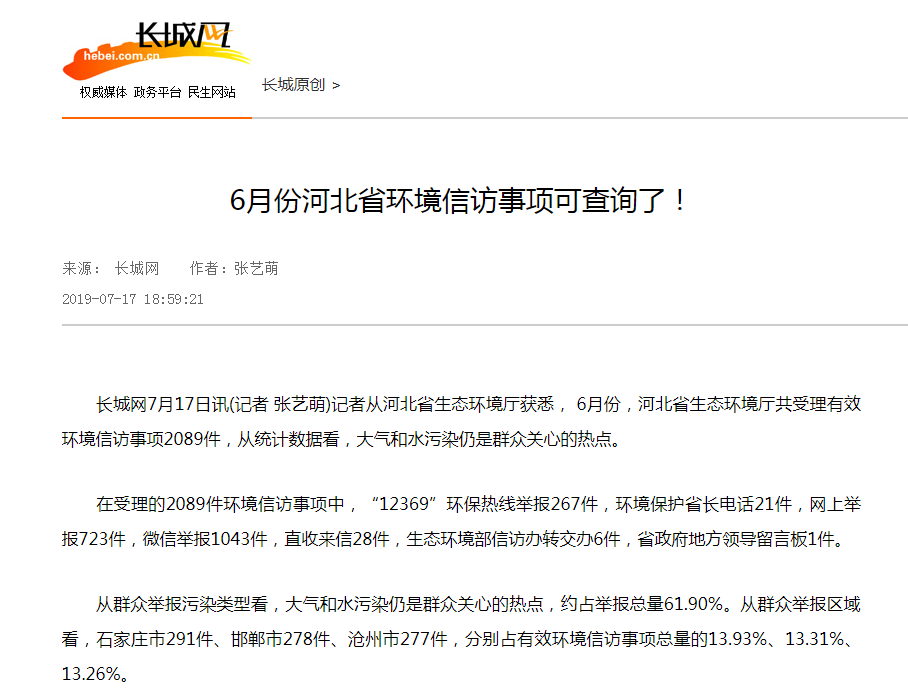 长城网:6月份河北省环境信访事项可查询了!