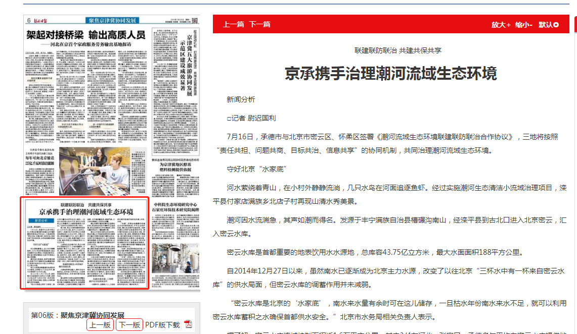 7月16日,承德市与北京市密云区、怀柔区签署《潮河流域生态环境联建联防联治合作协议》,三地将按照 “责任共担、问题共商、目标共治、信息共享”的协同机制,共同治理潮河流域生态环境。