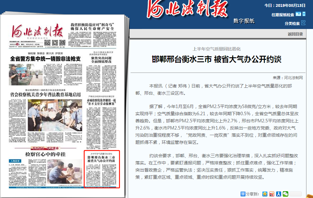 本报讯 (记者 郑伟)日前,省大气办公开约谈了上半年空气质量恶化的邯郸、邢台、衡水三设区市。