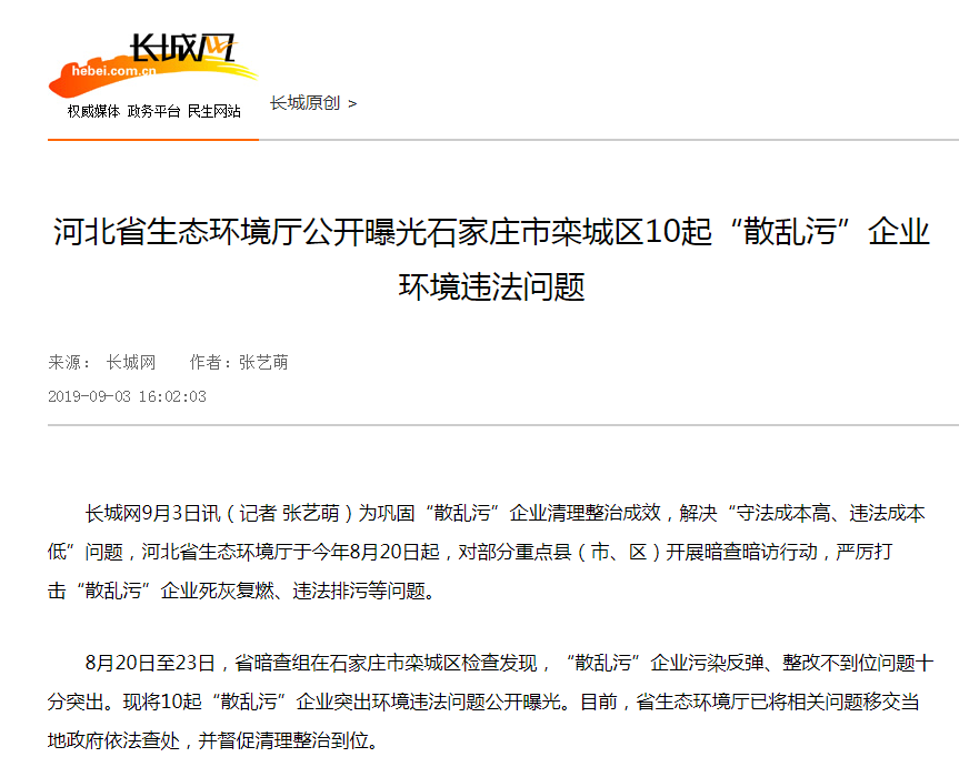 长城网9月3日讯(记者 张艺萌)为巩固“散乱污”企业清理整治成效,解决“守法成本高、违法成本低”问题,成人视频 于今年8月20日起,对部分重点县(市、区)开展暗查暗访行动,严厉打击“散乱污”企业死灰复燃、违法排污等问题。