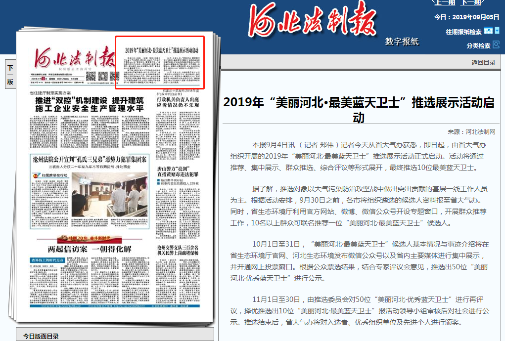 本报9月4日讯 (记者 郑伟)记者今天从省大气办获悉,即日起,由省大气办组织开展的2019年“美丽河北·最美蓝天卫士”推选展示活动正式启动。活动将通过推荐、集中展示、群众推选、综合评议等形式展开,最终推选10位最美蓝天卫士。