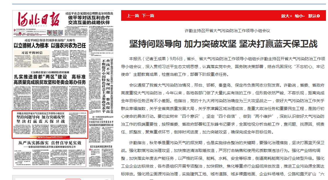 许勤指出,秋冬季是重污染天气的频发期,也是实施综合整治的关键期,要强化治理措施,坚决打赢蓝天保卫战。强化散煤污染治理攻坚,加快推进清洁取暖改造,严厉打击销售和使用劣质散煤违法行为。强化产业结构调整,加快落实年度去产能任务,以严格的环保、能耗、水耗、安全等标准,倒逼高耗能高污染行业转型升级。强化工业企业达标排放,各市县组织开展专项整治,加快钢铁、焦化等重点行业超低排放改造,推进工业污染源全面达标排放。强化扬尘面源污染治理,实施建筑工地、城市道路、城乡裸露地面、企业料场堆场、公路和露天矿山“六尘共治”。强化重型柴油货车和非道路移动源污染治理,集中开展成品油市场专项整治。强化差异化管控,实施涉气企业排放定量核查,分类精准管理,做到多排多限、少排少限、不排不限,坚决防止“平时不作为急时一刀切”。强化重污染天气应对,完善应急预案,加强与京津等周边地区的联防联控。