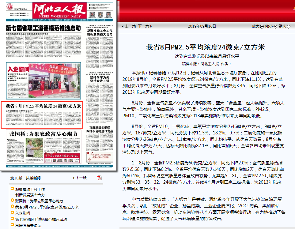 获悉,在刚刚过去的2019年8月份,全省PM2.5平均浓度仅为24微克/立方米,同比下降11.1%,达到有监测记录以来单月最好水平;8月份,全省空气质量综合指数为3.46,同比下降9.2%,为2013年以来历史同期最好水平。