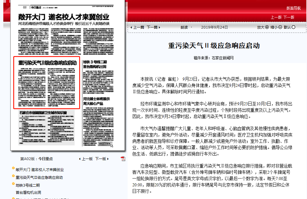 本报讯(记者 崔虹) 9月23日,记者从市大气办获悉,根据研判结果,为最大限度减少空气污染,保障人民群众身体健康,我市决定9月24日零时起,启动重污染天气Ⅱ级应急响应。具体解除时间另行通知。 经市环境监测中心和市环境气象中心研判会商,预计9月23日至10月3日,我市将出现一次长时间、连续性的轻度至中度污染过程,个别时段将出现重度及以上污染天气。因此,我市决定9月24日零时起,启动重污染天气Ⅱ级应急响应。 市大气办温馨提醒广大儿童、老年人和呼吸道、心脑血管病及其他慢性疾病患者,尽量留在室内,避免户外活动,尽量减少开窗通风时间;医疗卫生机构加强对呼吸类疾病患者的就医指导和诊疗保障。一般人群减少或避免户外活动;室外工作、执勤、作业、活动等人员,可采取佩戴口罩、缩短户外工作时间等必要的防护措施。倡导公众绿色生活、低碳出行,提倡徒步或骑自行车外出。 应急响应期间,市主城区将执行重污染天气Ⅱ级应急响应限行措施,即对非营运载客汽车及轻型、微型载货汽车(含外埠号牌车辆和临时号牌车辆),采取2个车牌尾号一组轮换限行的方式。尾号是英文字母或汉字的,以最后一个数字为准。每天7:00至20:00,限制20%的机动车通行,限行车辆尾号与北京市保持一致,法定节假日和公休日不限行。 公共汽车、出租车、长途客运车(含旅游客车)、残疾人专用车、经公安交管部门核定的学校校车,以及持公安交管部门核发《班车通行证》的通勤班车;执行任务的警车、消防车、救护车、军车、车身喷涂统一标识并执行执法任务的行政执法车;环卫、园林、道路养护的专项作业车辆,以及殡葬专用车辆、邮政专用车辆、专用清障车、持公安交管部门核发《抢修通行证》的抢险车;悬挂合法号牌的纯电动汽车、插电式混合动力汽车、燃料电池汽车;经批准的其他应急车辆等不限行。 同时,除运输民生保障物资、特殊需求产品车辆外,市主城区和各县(市、区)城区内24小时禁止重型、中型货车和三轮汽车、低速载货汽车、拖拉机通行;施工工地、工业企业厂区和工业园区内,禁止使用国二及以下非道路移动机械;矿山、洗煤厂等涉及大宗原料和产品运输(日常车辆进出量超过10辆)的单位,禁止使用国四及以下重型载货汽车(含燃气)进行运输。