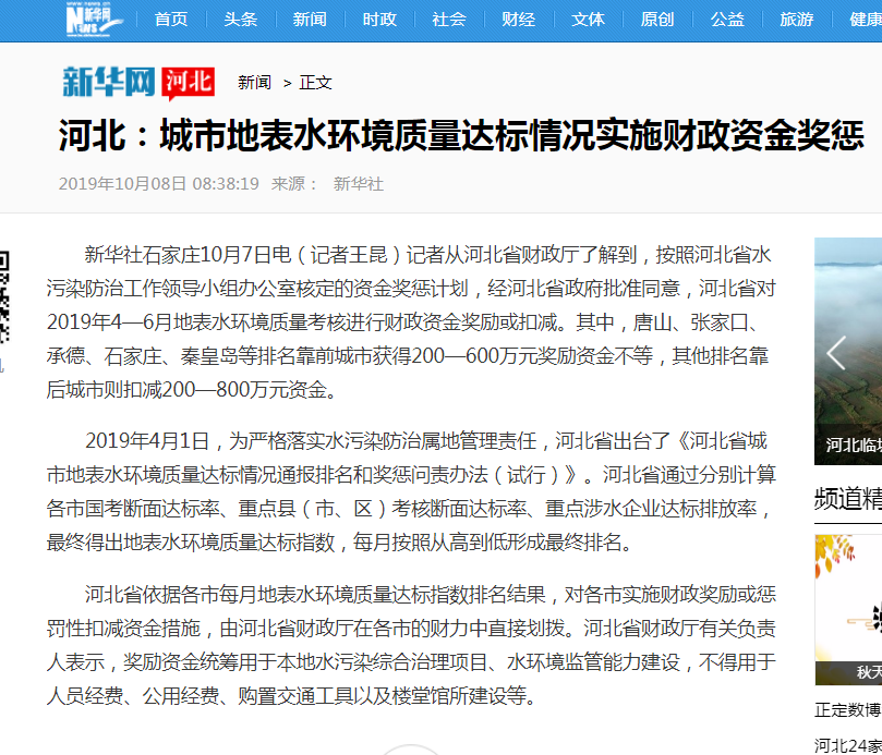 2019年4月1日,为严格落实水污染防治属地管理责任,河北省出台了《河北省城市地表水环境质量达标情况通报排名和奖惩问责办法(试行)》。河北省通过分别计算各市国考断面达标率、重点县(市、区)考核断面达标率、重点涉水企业达标排放率,最终得出地表水环境质量达标指数,每月按照从高到低形成最终排名。