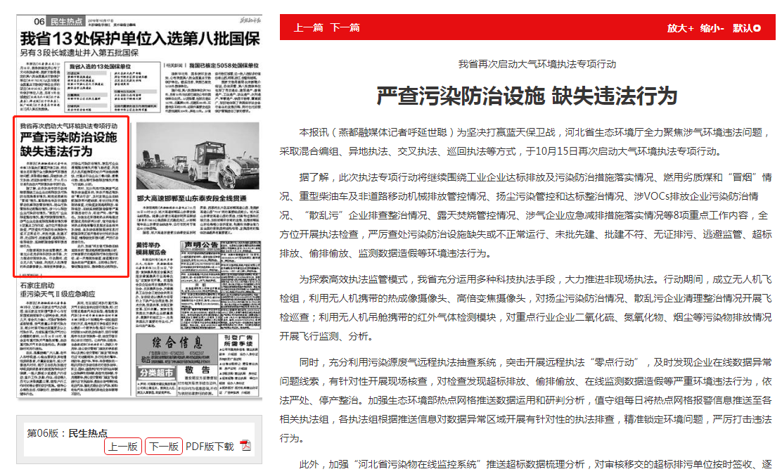 此外,加强“河北省污染物在线监控系统”推送超标数据梳理分析,对审核移交的超标排污单位按时签收、逐一开展现场核查,核查属实的坚决依法严查重处,立即停止排污,督促整改到位,确保稳定达标排放。