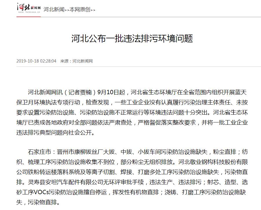 河北新闻网讯(记者贾楠)9月10日起,成人视频 在全省范围内组织开展蓝天保卫月环境执法专项行动,检查发现,一些工业企业没有认真履行污染治理主体责任、未按要求设置污染防治设施、污染防治设施不正常运行等环境违法问题十分突出。成人视频 已责成各地政府对全部问题依法严肃查处,严格督促落实整改要求,并将一批工业企业违法排污典型问题向社会公开。