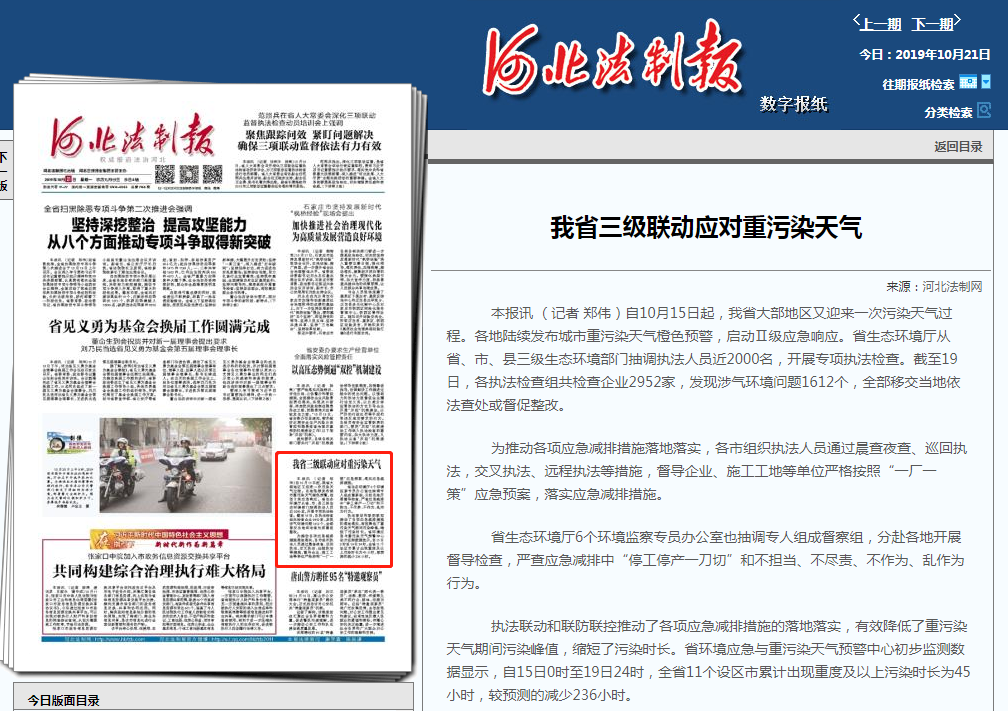 执法联动和联防联控推动了各项应急减排措施的落地落实,有效降低了重污染天气期间污染峰值,缩短了污染时长。省环境应急与重污染天气预警中心初步监测数据显示,自15日0时至19日24时,全省11个设区市累计出现重度及以上污染时长为45小时,较预测的减少236小时。