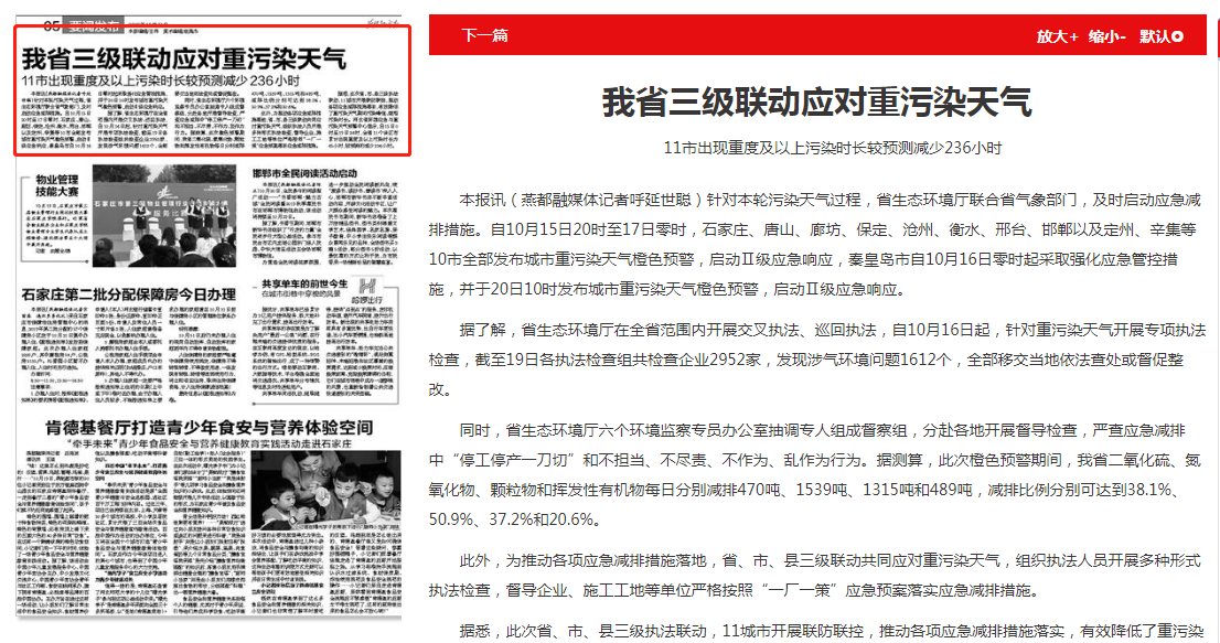 据悉,此次省、市、县三级执法联动,11城市开展联防联控,推动各项应急减排措施落实,有效降低了重污染天气期间污染峰值、缩短污染时长。河北省环境应急与重污染天气预警中心显示,自15日0时至19日24时,全省11个设区市累计出现重度及以上污染时长为45小时,较预测的减少236小时。