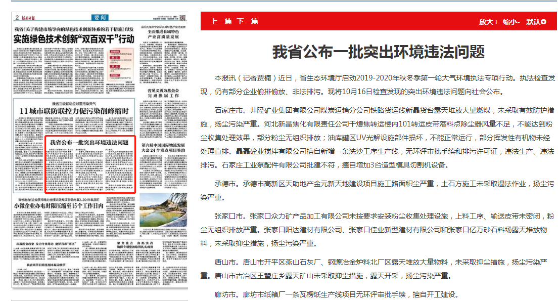 邢台市。河北运良机械制造股份有限公司焊接工序污染防治设施擅自停运,废气直排。邢台建工商品混凝土有限公司批建不符,擅自增加2台筛沙设备。