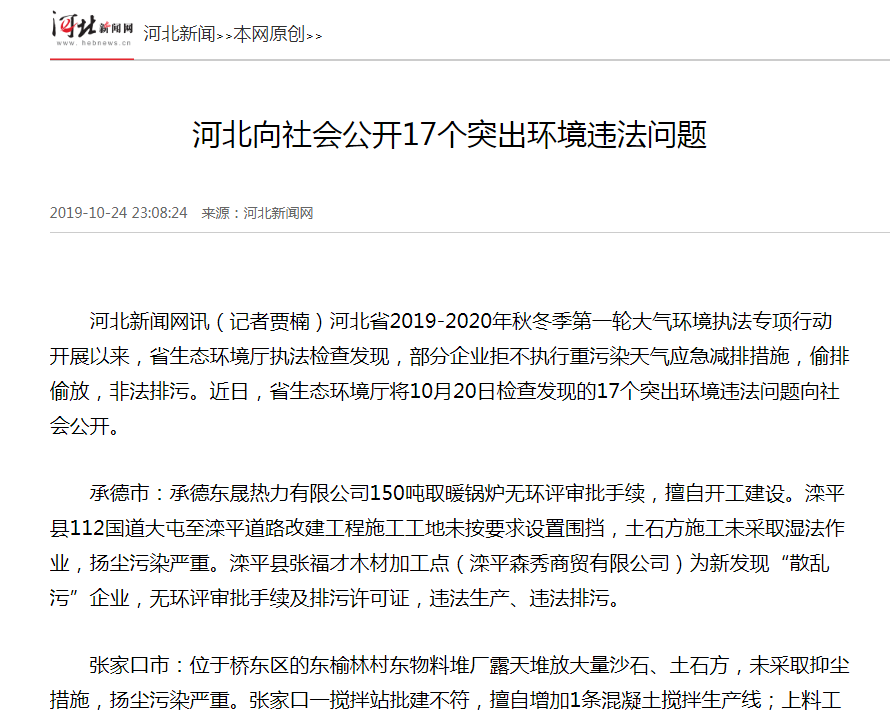 河北新闻网讯(记者贾楠)河北省2019-2020年秋冬季第一轮大气环境执法专项行动开展以来,成人视频 执法检查发现,部分企业拒不执行重污染天气应急减排措施,偷排偷放,非法排污。近日,成人视频 将10月20日检查发现的17个突出环境违法问题向社会公开。