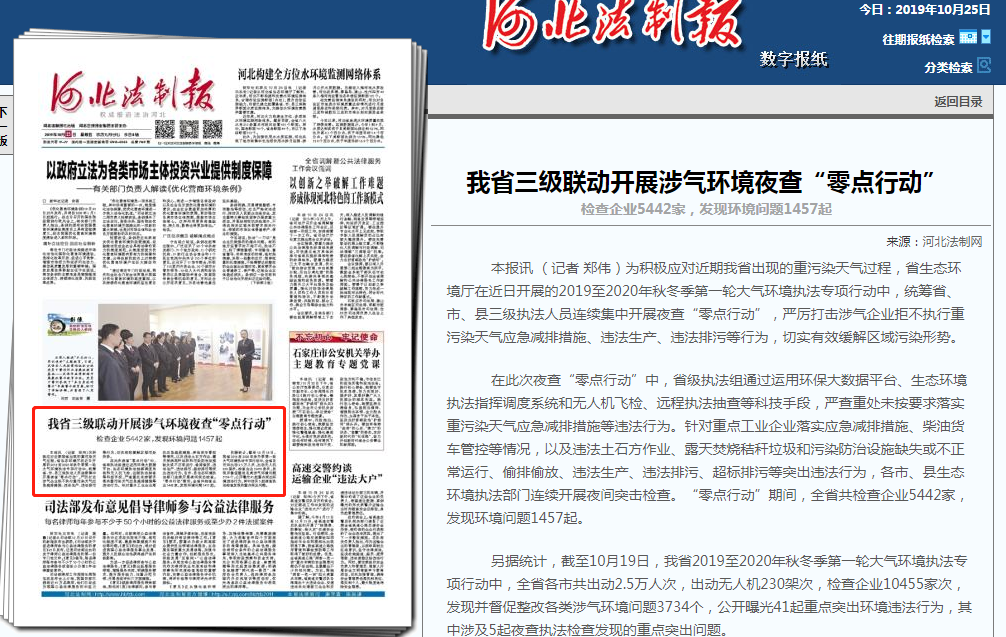 在近日开展的2019至2020年秋冬季第一轮大气环境执法专项行动中,统筹省、市、县三级执法人员连续集中开展夜查“零点行动”,严厉打击涉气企业拒不执行重污染天气应急减排措施、违法生产、违法排污等行为,切实有效缓解区域污染形势。